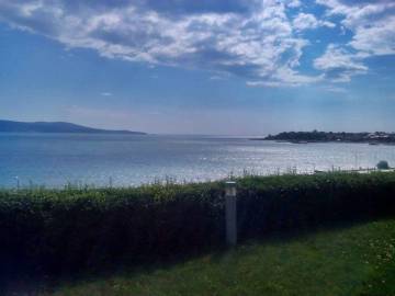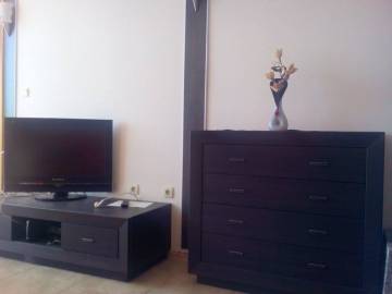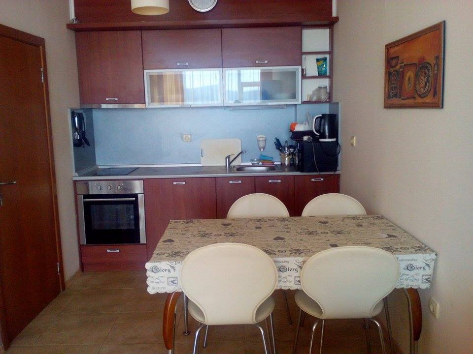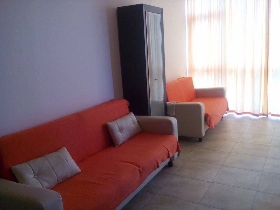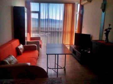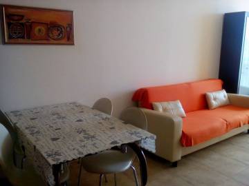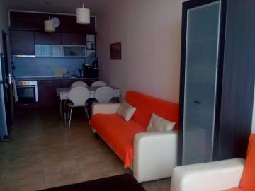 The property for rent is a modern and beautifully furnished apartment, which consists of a living room with a dining room and an open kitchen area, bathroom, bedroom and a balcony facing towards the sea.